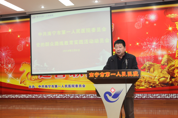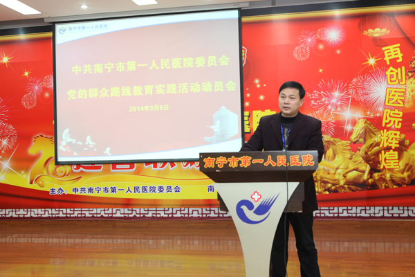 2014年3月6日,南宁市第一人民医院召开党的群众路线教育实践活动动员大会,医院党的群众路线教育实践活动正式全面启动。南宁市卫生局第一督导组组长、局党委书记汤晓斌同志及全体组员到会督导,会议由市一医院院长韦金儒同志主持,党委书记黎君君作动员讲话,医院党政领导班子成员、医院人大代表、政协委员代表、离退休党员代表、党员干部职工等300余人参加了会议。