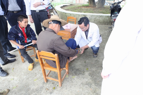 市一医院开展群众路线教育实践活动以来,结合医疗行业特色,充分发挥医院医疗资源优势,坚持开展了一系列义诊活动,为社区及扶贫共建村的群众送体检、普及健康知识,获得了良好的社会评价。2014年4月30日,医院继续派出由医疗专家和志愿者组成的义诊队伍,医院党委书记黎君君、副书记刘津江带队,前往上林县明亮镇甘六村——医院扶贫共建联系点开展义诊和健康教育宣传活动。