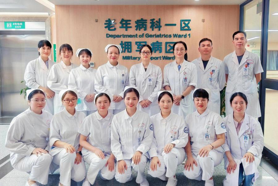 老年病科一区成立于 1992 年,原为干部保健病房,现位于医院 2 号楼 18 楼,长期以来承担着干部保健以及老年医学专业的医疗、教学、科研及护理工作,并于 2021 年与南宁市军队退休干部休养所开展合作,成立拥军病区,开设就医绿色通道,提升军休人员健康养老获得感,现已形成集医疗、保健、教学和科研为一体的综合学科体系。科室始终追求服务第一、患者至上的宗旨,通过扎扎实实的业务学习和技术训练,对老年常见病、多发病及危急重症的救治水平不断提高,科室技术力量雄厚,医疗设备先进,能为老年患者提供优质、规范的临床诊疗服务,从而为老年患者的健康保驾护航。科室现有医护人员 21 人,医生 8 人,护士 16 人,其中主任医师 1 人,副主任医师 3 人,主治医生 2 人,住院医师 2 人,副主任护师 2 人,主管护师 6 人,护师 5 人,护士 3 人。