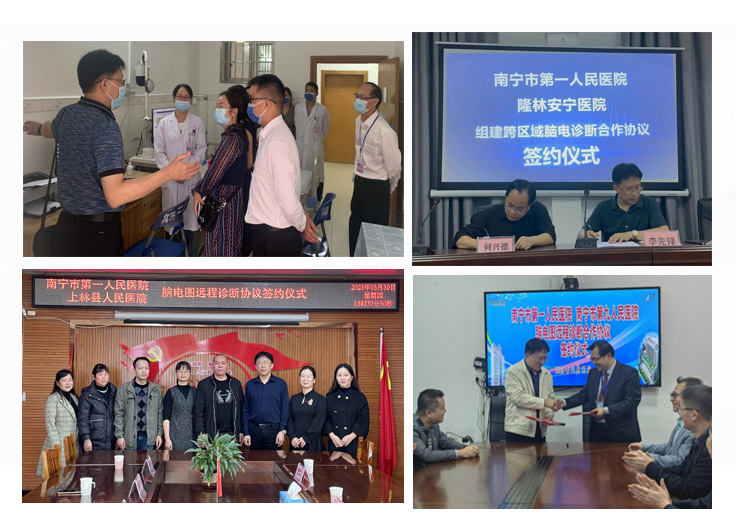 通过互联网软件,开展远程脑电判读,将基层医院的脑电图图像完整地上传到南宁市第一人民医院神经内科二区中心平台,由专家团队进行判读诊断,出具诊断报告,可解决群众就医难、多跑路的难题,实现群众在家门口即可享受到三甲医院的诊疗服务,用于监测癫痫、脑卒中、中枢神经系统感染等脑部疾病的脑电情况,辅助确定治疗方案,评估治疗效果,进行预后判定。