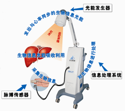 生物信息红外肝病治疗仪( BILT 治疗仪)是一种新的非药物治疗肝病技术。通过该仪器的治疗,可以使门静脉的血流量显著增加,改善肝脏的血液循环,使肝细胞得到充足的血、氧及营养物质,有效改善肝细胞新陈代谢。
