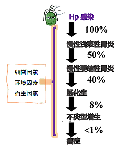 Hp感染后会在多种因素作用下损伤我们的胃粘膜,进行以下的疾病进展:慢性浅表性胃炎→慢性萎缩性胃炎→肠化生→不典型增生→癌症。所以若不及时干预,将逐渐严重化,甚至发展为癌症。