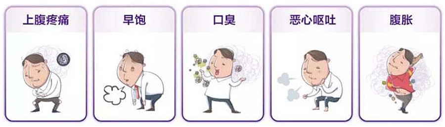 Hp感染可能伴随多种症状(如:上腹疼痛、早饱、口臭、恶心呕吐、腹胀等)