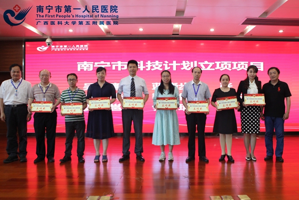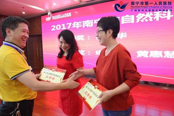 会上,分管科研工作的吴曙粤副院长对2017年度科技工作进行了总结,通报医院2017年度科研立项、科研成果获奖及学术论文发表情况。随后韦金儒院长宣读了《关于表彰2017年度南宁市科学技术进步奖、广西医药卫生适宜技术推广奖获奖项目及科研立项项目科技人员的通报》,对获得2017年度南宁市科学技术进步奖的1项科技成果、广西医药卫生适宜技术推广奖的3项科技成果、2017年获得的各级科研立项的31项科研项目及2017年3篇获得南宁市自然科学优秀论文奖励的科技人员予以通报表彰。院领导为获奖项目组和个人进行了颁奖。
