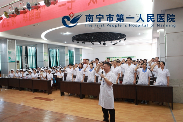 培训开始前,医院领导和职能中层干部与新职工见面并合影。韦金儒院长发表了热情洋溢的讲话,热烈欢迎新职工的到来,并对新职工提出了要求和希望,希望大家能尽快融入南宁市第一人民医院这个大家庭,虚心学习、奋发进取,在本职岗位上立志成才。