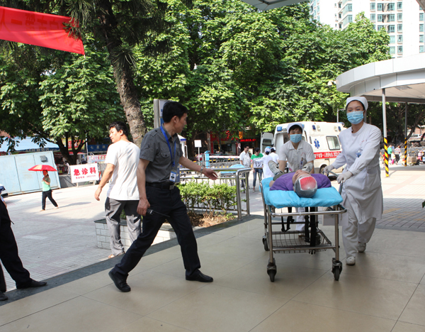为了提高我院对重大突发公共卫生事件的应对能力和处置能力,确保我院绿色通道畅通有序,5月10日,我院开展重大突发公共卫生事件大批急性创伤患者救治暨绿色通道应急演练。此次应急演练于当天上午在急诊科进行,黄宗贵副院长、医务部、急诊科及相关临床科室参加了演练。 上午9点10分,演练正式开始。急诊科分诊台接到120通知,将有10名车祸伤员被送到我院进行抢救,其中包括2名重伤员,分诊台护士第一时间上报科室主任、护士长。科室主任、护士长逐级上报医务部、护理部、院领导,接到启动应急预案的指示后,立即组织救援力量,做好抢救准备。随后救护车陆续到达,应急救援人员根据分配好的抢救任务,按流程处置伤员。最后,10名伤员得到及时救治,本次演练圆满结束。此次演练涉及急诊科、保卫科、放射科、超声科、心电图、神经外科、骨科、胃肠外科、肝胆外科、ICU等多个临床及医技科室,整个演练过程紧张有序,接警调度、应急准备、捡伤分区、抢救处置、伤员分流等各个环节医护人员都迅速到位、熟练配合,抢救过程合理,节奏紧凑,各项操作快、准、正确。 通过此次演练,我院的应急处置、抢救能力得到了明显提升,急救队伍得到了良好的锻炼。演练结束后,由黄宗贵副院长进行了总结,他对本次演练取得的成绩予以了充分肯定,也指出本次演练中暴露的一些问题和不足之处,要求有关科室和部门认真分析总结,并加以改进,不断促进我院应急救治能力的提高。(医务部)