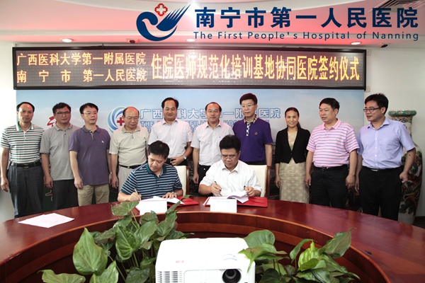 为更好地开展住院医师规范化培训工作,经广西医科大学协调,7月29日下午,在广西医科大学第一附属医院住院部21楼会议室,韦金儒院长代表我院与广西医科大学第一附属医院签署了《关于挂靠作为住院医师规范化培训协同医院的协议》。双方结合工作实际,共同努力建立广西统一的标准化、规范化培养模式,加强基地建设,以提高住院医师规范化培训工作质量。