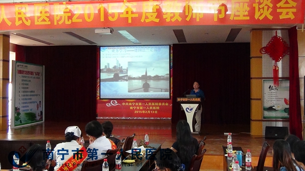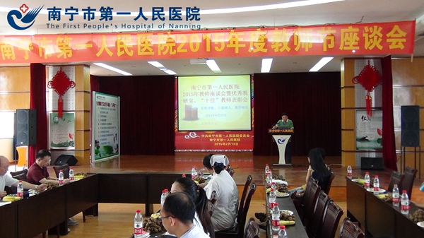 金秋教师节即将来临之际,8月25日下午,我院在医院礼堂召开2015年教师座谈会暨优秀教研室及“十佳”教师表彰会。会议特别邀请我院近年来到国外学习人员的代表分享他们在国外学习的经历。医院领导、科教科、医务部、护理部、优秀教师代表、各医学院校实习生代表、各教研室主任及秘书100余人参加了会议。