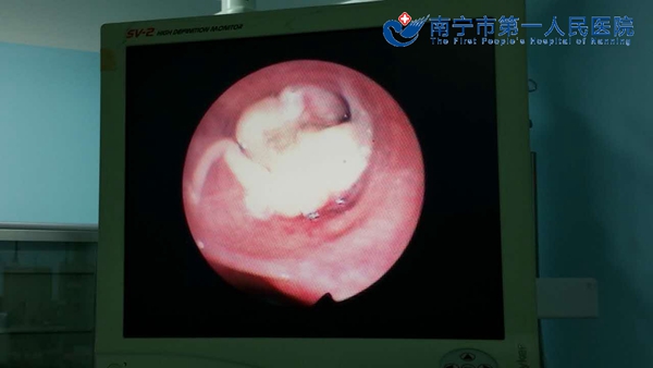 “患者,女,63岁,重症气道梗阻,既往无肺部基础病病史,入院后纤支镜下发现两肺气道异物,性质未明,阻塞气道,呼吸机参数高,氧合差……”病人病情极其危重,呼吸急促,为了明确气道异物情况,2015年10月26日上午ICU刘凤鸣副主任医师亲自操作,在纤支镜下观察异物大小、部位,镜下看到气道异物完全堵塞气道,形似虫体样赘生物。ICU决定采取多学科会诊,集全院之力量,解病人之所急!