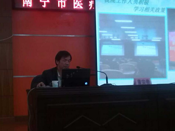 南宁市司法局、南宁市卫生局、南宁市公安局为了落实习总书记在全国两会上关于“维护医疗秩序”的讲话,特于2014年3月19日举办全市(含六县六城区)的司法局、卫生局、二级以上医序机构主要负责人(含驻邕中区直机构)等260多人医疗秩序培训。培训班由我院黄宗贵副院长负责授课,黄副院长的授课得到了很高评价,达到了很好效果,正面宣扬了我院的形象。