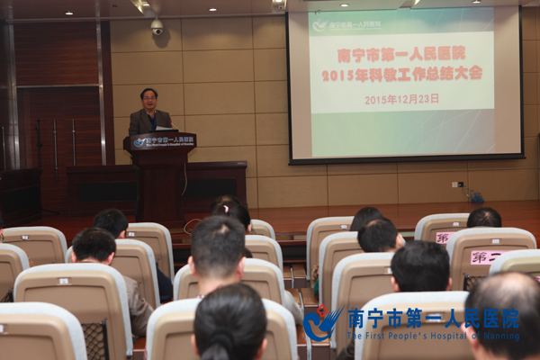 12月23日下午,南宁市第一人民医院2015年科教工作总结大会在门诊综合楼20楼多功能厅隆重召开。医院领导、相关科室人员和参加规范化培训学员,共100余人参加了会议。
