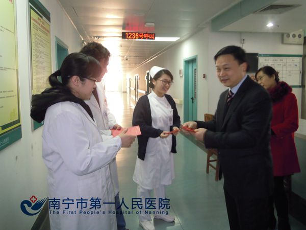 2月8日,猴年正月初一一大早,南宁市第一人民医院韦金儒院长、黎君君书记带领副职领导和院办、党办、医务、护理、总务、设备等职能部门负责人,分成五组下一线慰问在岗的医务、后勤值班人员。