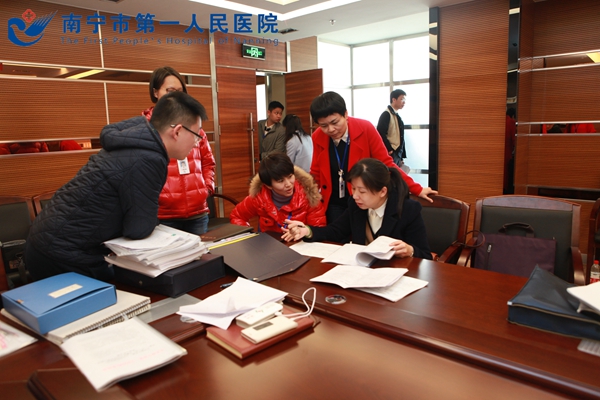 韦院长首先向检查组汇报了医院2015年各项工作的开展情况及亮点。随后检查组专家分头分别下到各个职能科室,通过查看资料、现场走访、谈心谈话等方式开展实地检查。检查组根据检查标准的相关要求逐项仔细检查,针对存在的问题当场指出并提出整改意见。