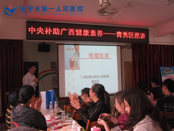 为倡导健康优先理念,加强健康促进建设,围绕卫生计生重点工作,结合健康中国行——2015年度无烟生活主题宣传教育活动,加大控烟宣传。3月9日下午,青秀区卫计局、青秀区疾病预防控制中心主办,南湖街道办、金湖居委会、埌东分院南湖社区卫生服务中心协办,邀请自治区人民医院保健科粟发沃主任,对辖区居民适时开展控烟的健康教育讲座,针对吸烟危害、劝阻吸烟技巧等知识的普及,树立正确的人生观和健康生活方式,呼吁从我做起,影响和关注身边的人,认清吸烟对个人,家庭,社会的危害才能避免吸烟的危害。
