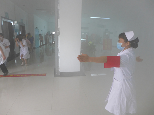 “消防演练正是开始!”随着现场总指挥命令的下达, 两名安全人员点燃烟饼,整个输液室外大厅瞬间被烟雾笼罩,变成一个“火海”。此时警笛彻响,而医务人员并未慌忙,向上级报告、报警、关闭电源、关闭防火门等一切都做得井然有序。医院保安科立即组织保安人员带上灭火工具对现场火势进行控制。接警之后,公安,消防等部门迅速赶到现场,所有被困人员也在医护人员的正确引导下全部有序的撤离火场。最终,在医院、公安、消防的共同努力下将“大火”扑灭。整个演练过程紧张有序,各个环节医护人员都迅速到达指定工作位置、熟练配合,疏散过程合理,节奏紧凑,规范操作。