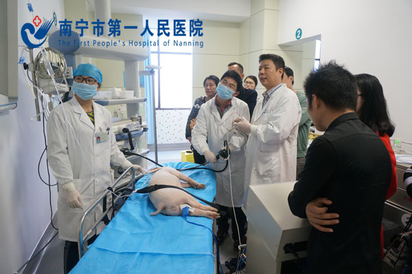 此次会议不同于以往各大内镜会议,不仅有内镜的演示,更有理论结合实践,最重要的是此次会议的动物实验内镜下操作是广西区内教学会议首次实施。整个学习班在我院消化内科唐少波主任热情洋溢的致辞中拉开序幕,理论阶段分别由农兵教授详细讲解目前早癌诊疗的国内外最新报道、南宁市第二人民医院内镜中心的吴县斌主治医师给年轻医师认真讲解如何规范的、认真的做好每一个胃镜、我院消化内科的张伟伟副主任医师结合我院消化内科内镜下所开展的诊治如早癌的诊治、内镜下支架的放置、ESD、EMR,POEM,特别是新仪器激光内镜的使用进行讲解。整个理论讲解过程,每个来学习的人都保持着高度的兴趣和认真的态度,让整个会议的氛围像春天一样温暖而热烈。在实践阶段,更是让每一个学员都激动的时刻,为了准备这次广西区内教学会议的首次动物实验,早在会议之前,我院消化内科的医师及护士已经成功实践了两次动物实验的内镜下操作。因此当天整个内镜下手把手的教学演示,让来自不同医院的医师根据自身的状态对内镜下EMR、ESD、POEM、粘膜下注射、止血、电切等各类技术一一操作,整个过程让学习班的学员更好的学习、交流,调动了大家的积极性,让学习的形式不再呆板,也让大家真正的学到了技术,受到了广大学员的一致好评。整个周末的学习在大家的意犹未尽中结束,虽然从周末的早上一直持续至下午,但是无论是理论讲解还是内镜实践操作,大家均倦意全无,始终保持着兴致勃勃的热情。(消化内科:谢榕)