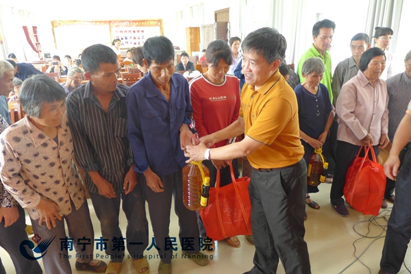 座谈结束后黎君君书记、韦金儒院长、卓永强主席代表医院党委向32户贫困群众赠送了大米、食用油等生活用品,把医院的关怀和温暖送到贫困村民身边。
