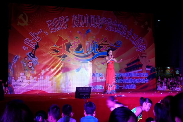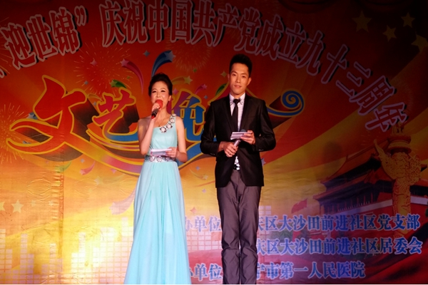 正值中国共产党建党九十三周年之际,为了给党送上真挚的祝福,以饱满的热情迎接第四十五届世界体操锦标赛在南宁举行,南宁市第一人民医院与良庆区大沙田街道前进社区在美丽广场联合举办庆“七·一、迎世锦”纪念中国共产党成立九十三周年文艺晚会。医院派出有着南宁市第一人民医院“百灵鸟”之称的宋梅朵与两位主持人参加当晚的演出。共有500多名群众欢聚一堂,观看了精彩的表演。