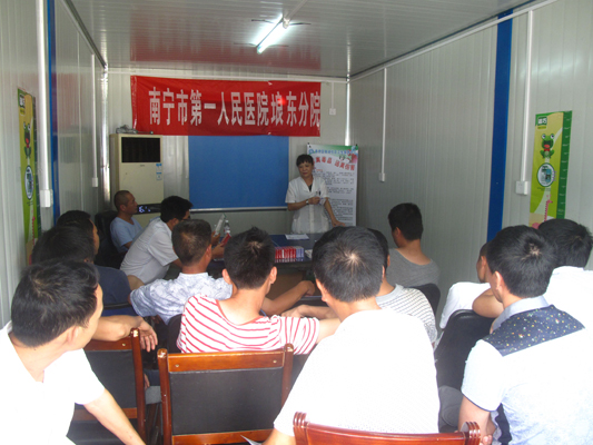 2014年6月27日下午,南宁市第一人民医院埌东分院携手中建三局和南湖社区卫生服务中心,赴中建三局霖峰壹号工地开展“关爱农民工,送健康进工地”活动,分院官江副院长带领12名医务人员志愿者参加了本次活动。志愿者们为一线务工人员进行健康体检,并向一线务工人员举办了禁毒艾滋病防治知识、工伤事故的预防及现场急救知识讲座。