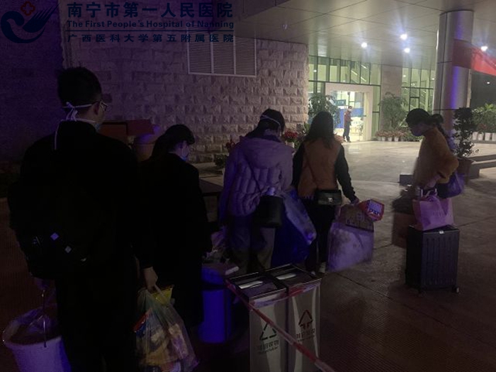 1月24日至26日,全体职工昼夜不停地持续作战,仅用三天时间便完成五层隔离病房的布置。目前青秀分院有护士74人,医生28人,医技人员17人。