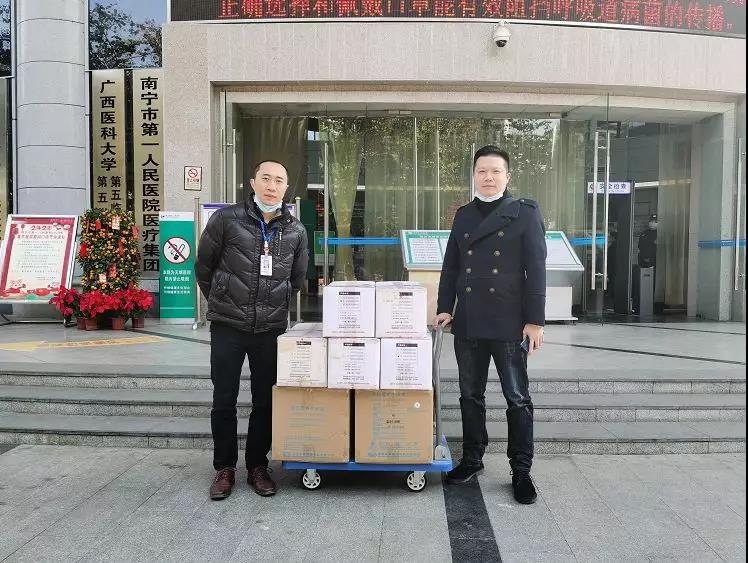 当白衣天使张开双翼护佑生命的同时,被守护者也回报以热爱、敬佩和支持。在因防护物资短缺向社会发出请求援助的呼声后,从四面八方转来了积极的反馈。1月29日,收到泰国方面捐赠口罩等物资一批;1月30日,收到南宁盛广汇医疗器械有限公司捐赠手套10000个、手术衣80套;1月30日,南宁市总工会慰问一线医护人员,带来价值5万元的慰问品;1月30日,一双儿女在市一医院儿科一区住院治疗的张先生,得知一线医院物资短缺,果断自费购买捐赠口罩2500只……更多机构和个人正与医院积极接洽,一只只口罩、一双双手套凝结的是一个个普通人“为众人抱薪者不可使其冻毙于风雪”的朴素情感。
