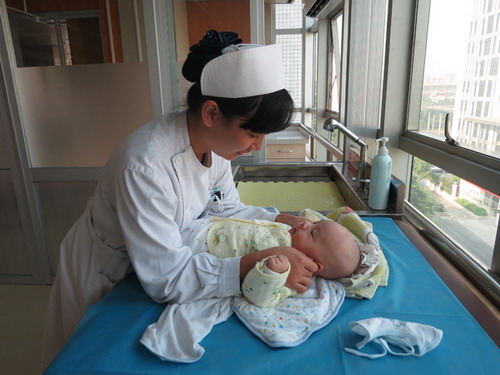 经过精心改造,埌东分院集洗澡、游泳、按摩为一体的爱婴室终于正式启用!并于11月21日首次迎来两位可爱的小“贵宾”,一位是1月多的玉宝宝,另一位是3月多的强宝宝。两位小“贵宾”在邱护长细心呵护下,从初下水的忐忑不安,到逐渐的适应直至在水里欢快的畅游,宝宝们的表现始终引人注目。他们欢腾地在水里游来游去,期间还和旁人互动,嘴里发出依依呀呀的应答,让医护人员和妈妈们欣喜不已。畅游之后宝宝们尽情享受着邱护长的温柔抚触,趣稚的小脸蛋露出了满足的笑容,妈妈们满意的幸福也一直挂在脸上。