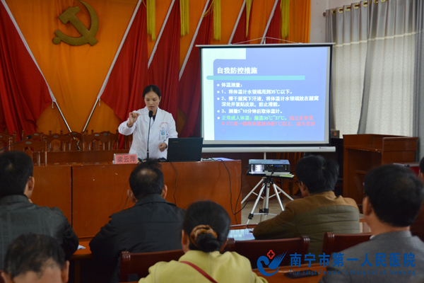 众所周知,当前非洲埃博拉出血热疫情发展形势严峻,近期在非务工人员返乡势必会产生疫情传播的安全隐患。而据最近统计,目前甘六村到非洲务工人员有两百多人。为提高村民预防意识、减少传播安全隐患,梁云萍同志依托市一医院资源优势,积极响应南宁市疾控中心关于“埃博拉疫情防控”知识普及到急需的基层的号召,认真着手组织开展了此次讲座。讲座以多媒体课件形式,深入浅出地讲解了埃博拉疫情防控知识,引起镇、村干部及村民们对疫情的高度重视,得到干部群众的肯定与称赞。会后,每位听众还获得由医院免费赠送的家庭备用小药盒及常用药、体温计等,累计赠送家庭备用小药盒300份,“埃博拉疫情防控”知识宣传手册1000份。此次讲座也受到当地媒体的广泛关注,上林县电视台、上林时讯等媒体记者分别进行了报道。(南宁市第一人民医院)