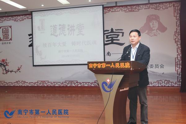 “前进,前进,向前进,走向复兴创造辉煌。”伴随着一曲振奋人心的《走向复兴》,南宁市第一人民医院本年度最后一期道德讲堂活动圆满结束了。12月5日下午,该院在医院礼堂举办了“续百年大爱,铸时代医魂”道德讲堂活动。南宁市卫计委党委副书记、副主任丁伟同志及该院领导、职工共300多人参加了本次活动。