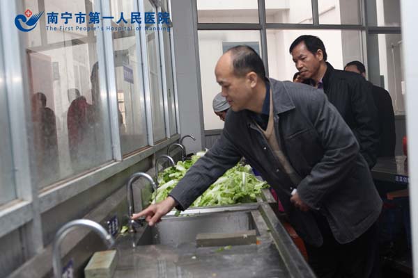 2015年1月5日上午,由自治区水利厅机关服务中心主任朱新玲处长、南宁市机关事务管理局粟瑜副局长、农江琳科长和市水利局林勇工程师等组成的自治区节水型单位建设验收工作组到我院检查验收评价创建自治区节水型单位工作情况。南宁市卫计委陈迪锋副调研员、医院党委黎君君书记、黄宗贵副院长等陪同检查。