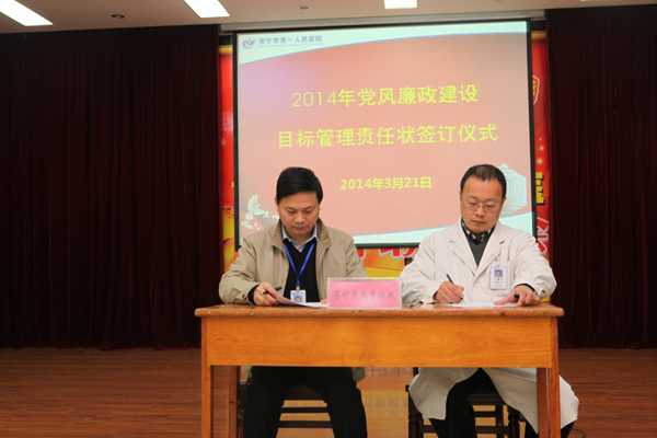 会议同时进行《2014年党风廉政建设目标责任状》签订。由院党委书记黎君君与门诊和妇科支部书记签订了2014年党风廉政建设责任状。