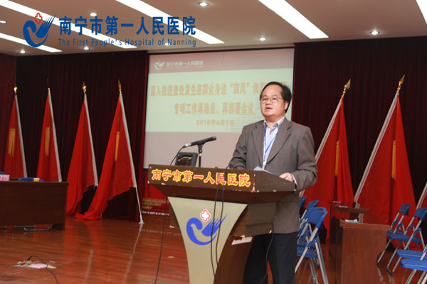 刘副书记简要介绍了我院近段专项工作开展情况,根据中共南宁市卫生和计划生育委员会《关于印发<南宁市卫生计生系统深入推进查处发生在群众身边的“四风”和腐败问题专项工作实施方案>的通知》精神,我院纪委及时制定下发了《关于印发<南宁市第一人民医院深入推进查处发生在群众身边的“四风”和腐败问题专项工作实施方案>的通知》和《关于印发<南宁市第一人民医院深入推进查处发生在群众身边的“四风”和腐败问题专项夜访活动实施方案>的通知》,各科室开展了组织学习和自我排查;医院开展了以“征求意见面对面,提升服务心连心”为主题大接访活动;成立了六个检查小组,通过夜访、行政查房等形式,深入科室对发生在群众身边的“四风”和腐败问题进行细致的问题线索排查。